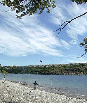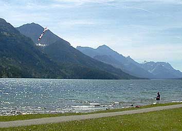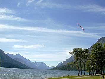Spontan tauschte ich in der Nähe von Waterton die Harley gegen ein Pferd und ritt durch die wilden Bäche der Rocky Mountains, bis ich mein Gesäß richtig spürte. Am Abend kommt eine angenehme Brise über den Gebirgssee und ich kann meinen Tourfavoriten, den Hot Stripe ausgiebig fliegen.