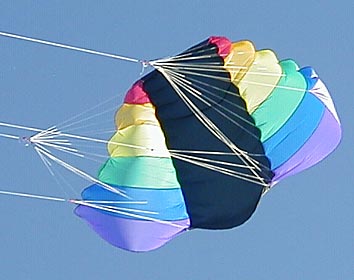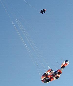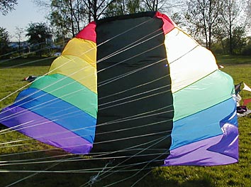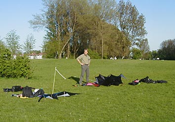 ![]() Naja, so sieht es aus wenn alle Drachen am Boden liegen. Ein NasaWing-Pilot ziemlich relaxt. Man achte auf das krampfhafte Festhalten der Griffe :-)) |