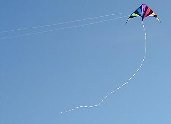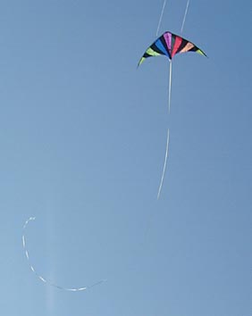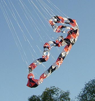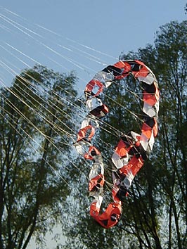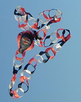 ![]() Sören hatte den Crossdeck der diesjährigen Kite & Bike Dreamtour mitgebracht. Außerdem hatte er eine Schlange zum Einhängen in die Leine genäht. |
